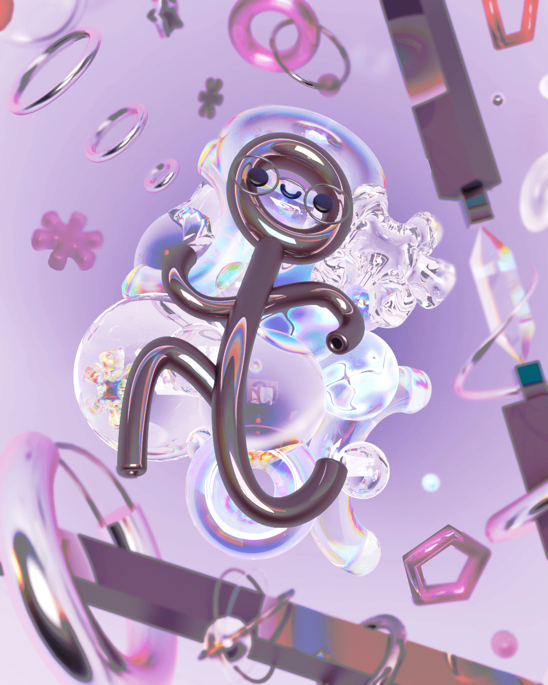 This was one of my first explorations into 3D using Cinema 4D and Redshift. The goal was to get comfortable with basic modelling, material nodes, and lighting setups — while still having fun with form and colour. I created this playful chrome character floating in a surreal bubble world, experimenting with HDRI reflections, glass shaders, and iridescent lighting. It’s weird, shiny, and slightly chaotic — just how a first 3D test should be.
